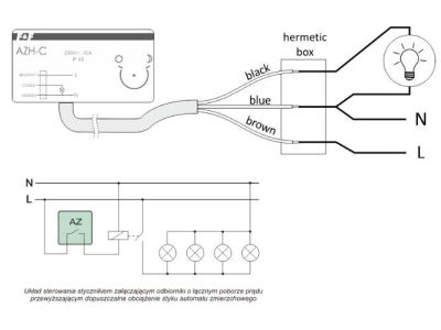 Stopień ochrony IP65 - hermetyczny Zasilanie 230 V. Maksymalne obciążenie 10 A. Hermetyczny. Element światłoczuły wbudowany.