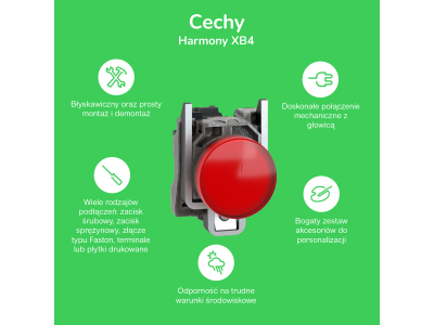Ten blok styków, stosowany do przełączania styków o małej mocy, umożliwia szybką i łatwą wymianę i konfigurację określonych produktów sterujących i sygnalizacyjnych. Jest łatwy w instalacji i wymianie w jednostkach sterujących i sygnalizacyjnych XB4 i XB5 i łączy się z obwodami sterującymi za pomocą prostych połączeń śrubowych. Chroni operatorów przed niespodziewanym kontaktem z obwodami pod napięciem dzięki certyfikatowi IP69K.