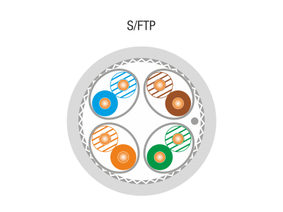 Przewód podwójnie ekranowany S/FTP (Shielded/Foiled Twisted Pair, oznaczenie zgodne z normą ISO/IEC 11801). Najwyższej klasy ekranowanie. Ekran w postaci oplotu z siatki miedzianej został umieszczony na ośrodku w którym każda para jest ekranowana dodatkowo folią aluminiową, pomiedzy ekranem a powłoką znajduje się drut uziemniający. Taka konstrukcja daje zwiększoną odporność na zakłócenia elektromagnetyczne (EMI) a indywidualne ekranowanie każdej pary eliminuje przesłuchy pomiędzy poszczególnymi parami. Zwarta, mocna konstrukcja zwiększa odpornośc na uszkodzenia mechaniczne podczas instalacji (większa odpornośc na siłę ciągnienia). W porównianiu z kablami nieekranowanymi przewód może zapewnić wyższą jakość i bezpieczeństwo transmisji danych. Kabel przeznaczony do pracy w środowisku wysoce narażonym na zakłócenia elektromagnetyczne, może znajdować się w bliskiej odległości od przewodów elektrycznych, sygnałowych i urządzeń mogących być źródłem lub nośnikiem zakłóceń elektromagnetycznych.