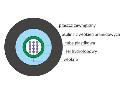 odległości: rozległe sieci telekomunikacyjne, szkieletowe, CATV, dostępowe, campusowe, WAN, FTTx. Włókna optyczne pozostają zabezpieczone przed wilgocią żelem hydrofobowym oraz wzmocnione antygryzoniowo włóknami aramidowymi.