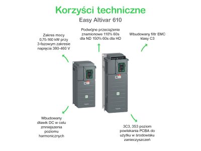 Ten napęd Easy Altivar 610 jest przetwornikiem częstotliwości dla trójfazowych silników asynchronicznych. Pracuje przy znamionowym napięciu zasilania od 380V do 415V AC. Nadaje się do silników o mocy znamionowej do 110kW / 150hp dla zastosowań wymagających lekkiego przeciążenia (do 120%). Nadaje się do silników o mocy znamionowej do 90kW / 125hp do zastosowań wymagających znacznego przeciążenia (do 150%). Oferuje rozwiązanie typu plug & play, w którym parametry są ustawione fabrycznie do pożądanej konfiguracji, co pomaga zaoszczędzić czas kontroli procesu i obsługi. Posiada zintegrowane filtry wejściowe zakłóceń radiowych zgodne z normą EMC dla produktów napędów elektrycznych o zmiennej prędkości IEC/EN 61800-3, wydanie 2, kategoria C3 w środowisku 1 lub 2.Waży 82kg, a jego wymiary to, 320mm szerokości, 852mm wysokości, 390mm głębokości.Napęd ten został specjalnie zaprojektowany do standardowych zastosowań w segmentach rynku wody i ścieków oraz ropy i gazu, a także w domenach zarządzania procesami i maszynami oraz zarządzania budynkami.