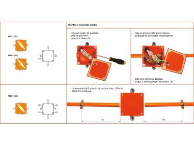 Stopień ochrony IP65, zakres uszczelnienia od 7 mm do 18,5 mm. Mocowanie poprzez zewnętrzne uchwyty montażowe do betonu za pomocą kołków stalowych. Do drabinek i korytek kablowych za pomocą śruby SGKM6x12. Montaż puszki na korycie siatkowym za pomocą uchwytu puszki UP1 lub UPP... i kompletu SGNM6x12 lub SGKM6x12