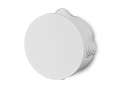 Puszka natynkowa IP44. Szybki montaż. NORMA: PN-IEC-60998-1:2006. Ilość wejść: 4 – dławnice. Wymiary wewnętrzne: 80x40 mm, Wymiary: Fi 90 x 44 mm.
