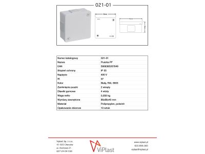 Puszka n/t 86x86x40mm IP55 4-wl 2wkr dł.gum. biała, VP-21 | 021-01 Viplast