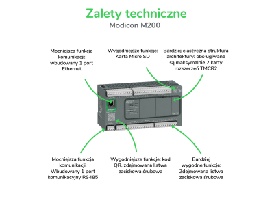 Ten produkt jest częścią gamy Easy modicon M200, oferty sterowników logicznych dla maksymalnie 168 I/O, 2 osiowego sterowania ruchem. Ten sterownik logiczny zapewnia 20 wejść typu sink source 24V DC, w tym 4 wejścia o dużej prędkości, 4 wejścia szybkie i 12 wyjść przekaźnikowych. Jest to sterownik logiczny Modicon o napięciu wejściowym 24V DC, dyskretnym napięciu wyjściowym 24V DC, 220V AC i prądzie wyjściowym 2A. Łatwy w utrzymaniu i aktualizacji dzięki karcie pamięci micro SD. Zintegrowane połączenia to mini B USB 2.0, nieizolowane łącze szeregowe 1 i RS485, nieizolowane łącze szeregowe 2 i RS232/RS485 oraz izolowane łącze szeregowe 2 i RS485. Jest to sterownik z wewnętrzną pamięcią flash o pojemności 512byte i pojemnością karty micro SD 32GB. Jego wymiary to 175mm (szerokość) x 70mm (głębokość) x 90mm (wysokość).Zaprojektowany do maszyn włókienniczych, obrabiarek, pakowania, przenoszenia materiałów, pompowania, podnoszenia, maszyn do montażu elektronicznego. Produkt ten posiada certyfikaty CE, CSA, IACS E10, RCM i CULus. Spełnia normy EN/IEC 61010-2-201 i EN/IEC 61131-2. Obsługuje montaż na szynie DIN. Sterownik PLC klasy podstawowej doskonale nadaje się do zaspokojenia specyficznych potrzeb rynków wschodzących w przystępnej cenie bez kompromisów. Najlepsze rozwiązania w zakresie stosunku wydajność/cena dla małych systemów automatyki wymagających elastyczności i prostego ruchu.