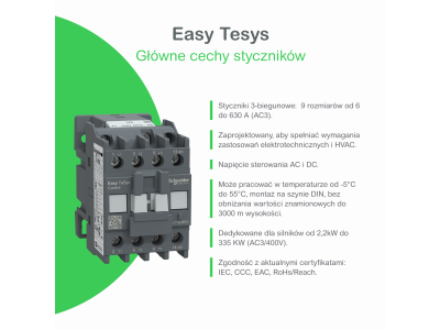 3-biegunowy stycznik Easy TeSys Control do zastosowań silnikowych do 80A 45kW przy 440V Wyposażony w cewkę 230V 50/60Hz AC, wbudowane styki pomocnicze NO+NC, połączenia zasilania i sterowania za pomocą zacisków śrubowych. Szerokość 85 mm , częstotliwość łączeniowa do 1200 cykli na godzinę. Zapewnia standardową niezawodność i trwałość -0,9 M cykli elektrycznych dla kategorii AC-3 i 3 M cykli mechanicznych. Może pracować w temperaturze od -5°C do 55°C i być montowany na szynie DIN, bez obniżania wartości znamionowych do 3000 m n.p.m. Certyfikowany zgodnie z wieloma normami (IEC, CCC, EAC) oraz zgodny z Green Premium (RoHs/Reach).