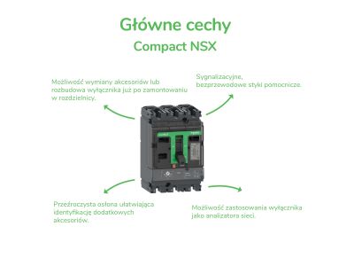 ComPacT NSX250F to kompletny 3-biegunowy, stacjonarny wyłącznik zaprojektowany z myślą o optymalizacji przestrzeni i zdolności wyłączania. Jest to optymalny wybór dla wszystkich standardowych i specyficznych zastosowań. Zdolność wyłączania (Icu) wynosi 36 kA (wartość skuteczna) przy 415 VAC 50/60 Hz. Napięcie robocze wynosi 690VAC 50/60Hz. Ten produkt zawiera wyzwalacz termiczno-magnetyczny (TMD) o mocy znamionowej 250 A. Wyzwalacz TMD zapewnia regulowane zabezpieczenie przeciążeniowe i stałe zabezpieczenie magnetyczne. Wersja 3-biegunowa (105 mm x 161 mm x 86 mm) jest wyposażona w szereg opcjonalnych funkcji i akcesoriów. Jest on zgodny z normami międzynarodowymi (IEC 60947), CCC, EAC i specyfikacjami morskimi. ComPacT NSX250F jest elementem architektury zasilania EcoStruxure Power firmy Schneider Electric.