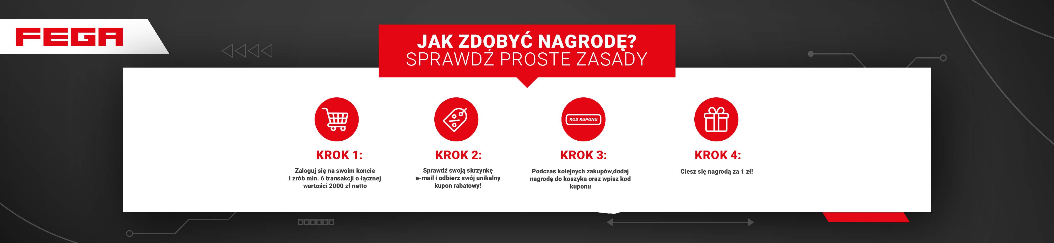 Zrób minimun 6 transakcji o łącznej kwocie min. 2000 zł w sklep.fega.pl i odbierz unikalny kupon rabatowy, który zostanie wysłany na Twój adres e-mail. Kupon możesz wykorzystać przy kolejnych zakupach w naszym sklepie internetowym dodając do koszyka produkt promocyjny oraz wpisując kod kuponu, obniżając tym samym wartość nagrody do 1 zł. Kupon jest ważny tylko 30 dni od momentu nadania.