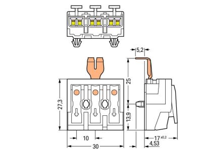 Złączka zasilająca z zatrzaskowym stykiem PE, ze stopkami zatrzaskowymi, N-PE-L, 3-bieg., biała | 294-5213 Wago